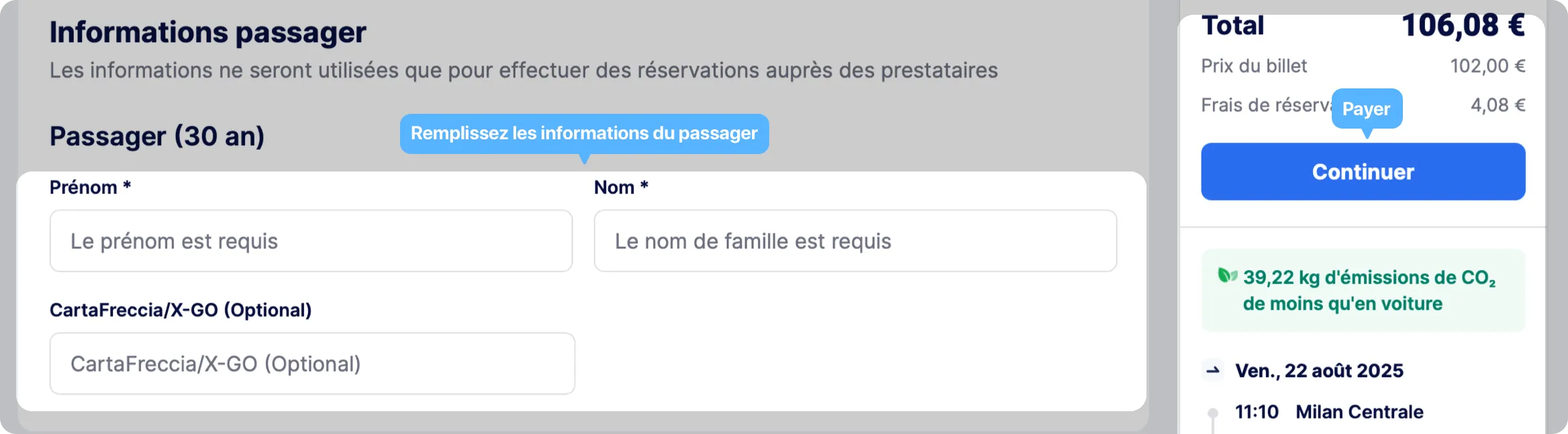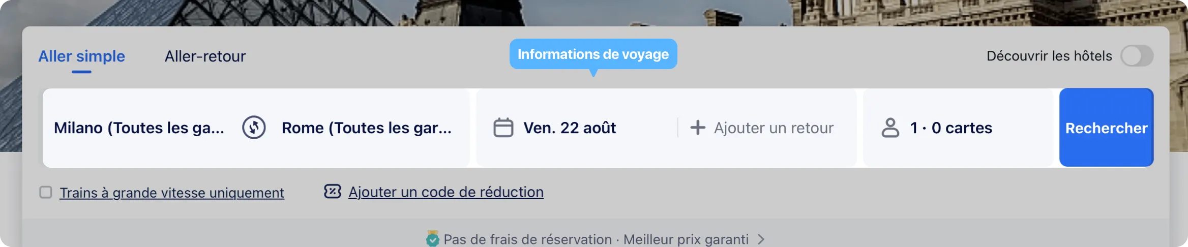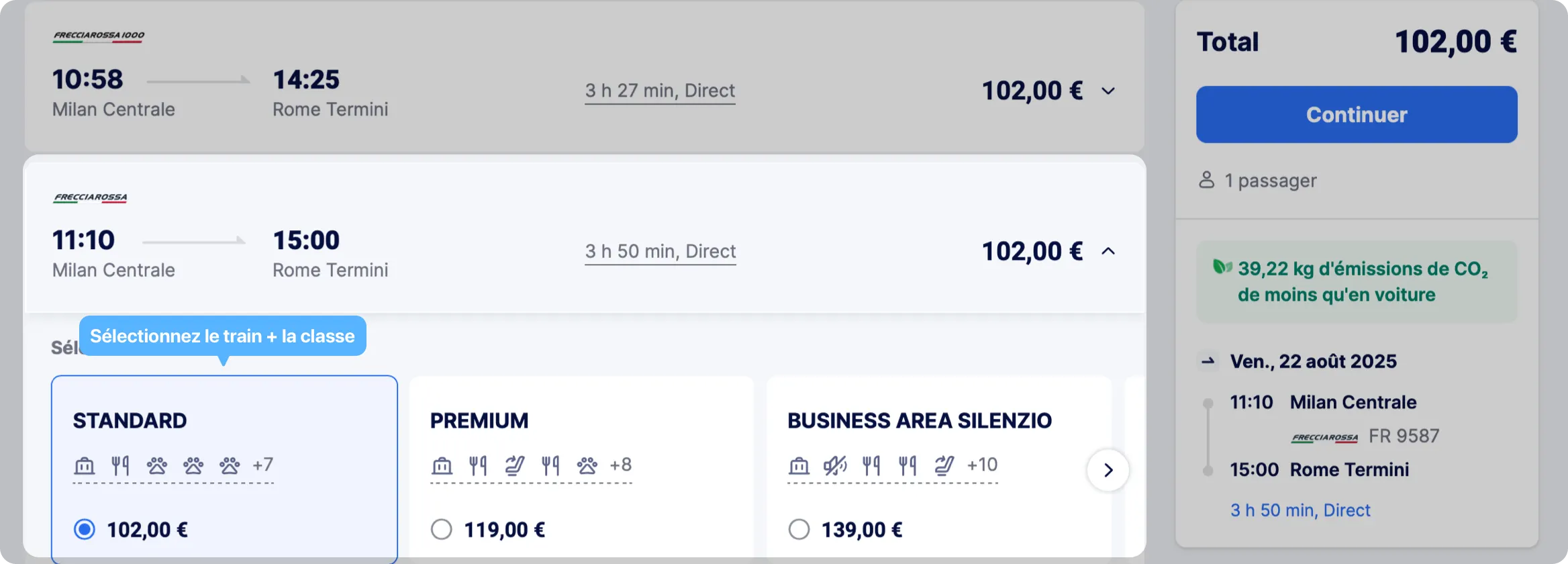 La ligne Frecciarossa Milan – Rome traverse la Lombardie, l'Émilie-Romagne, la Toscane et le Latium, avec des arrêts principaux à Milan, Bologne, Florence et Rome. Idéale pour les professionnels, les voyageurs et les touristes, elle assure des liaisons rapides et confortables entre les pôles économiques, culturels et institutionnels, avec des solutions flexibles pour tous les besoins de voyage, même aux heures de pointe.